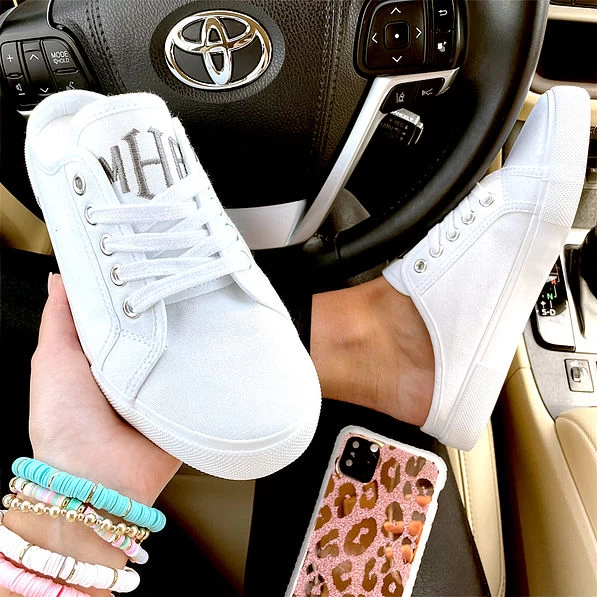 These canvas monogrammed slide on sneakers allow you to personalize them with the font, thread color and initials of your choice. They’re stylish enough to wear year round with skirts and dresses or jeans, leggings and shorts.