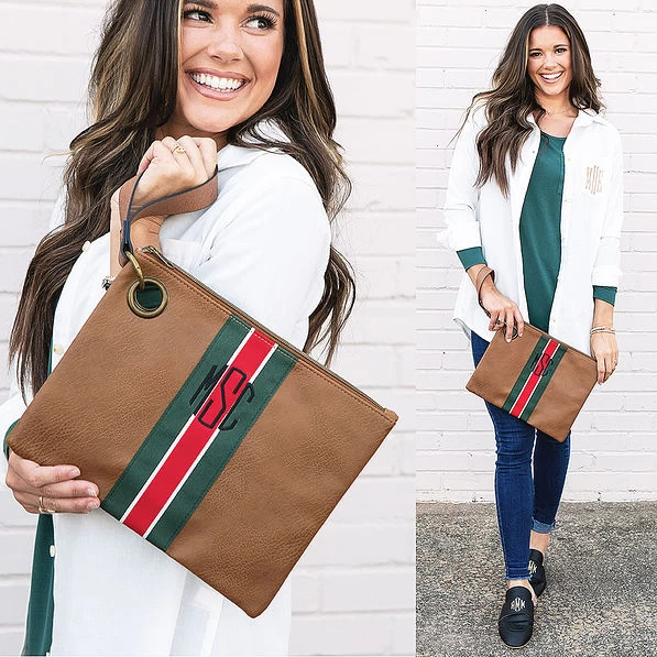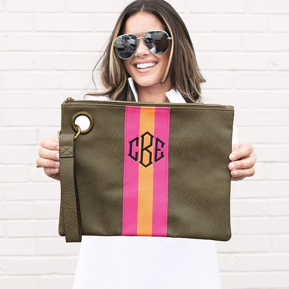 Our Monogrammed Wristlet Clutch is just the right size for keeping your phone, wallet, cosmetics, and more secure and organized. With many different embroidery color choices, you can make this clutch exclusively yours and wear it just the way you like. Consider giving this clutch as a thoughtful personalized gift — it’s perfect for friends, family and teachers gifts! Make sure to check out the coordinating tote bag – the Monogrammed Spencer Tote.