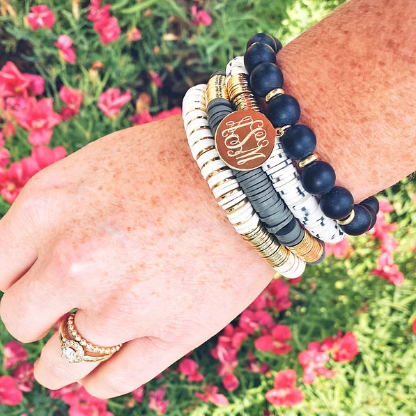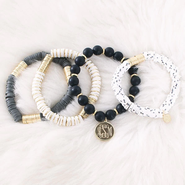 This black, white, and gold bracelet set features 4 neutral bracelets that make for the perfect accessory! This set includes a bracelet with a monogrammed 17mm gold charm and a mix of round beads and flat beads. You can wear this stack as a set or wear them individually depending on your desired look. Each beaded bracelet is stretchy so that it will fit almost any wrist size. Be sure to check out our entire collection of personalized jewelry.