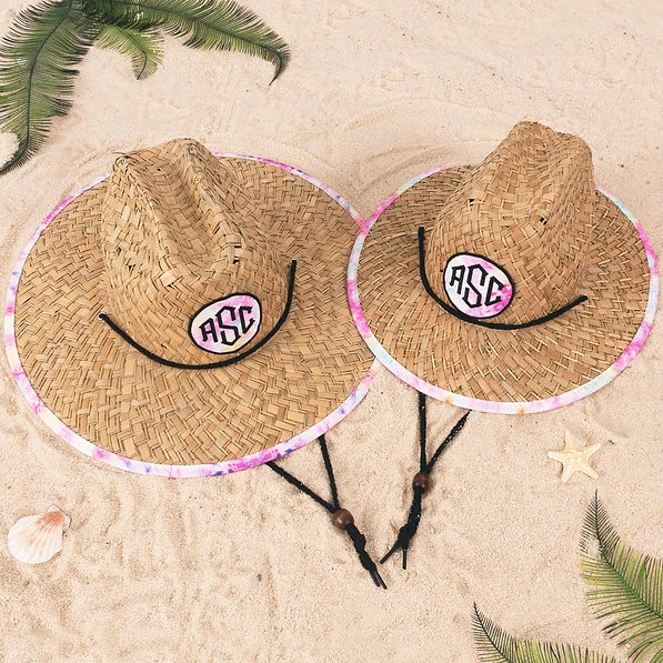 Our Monogrammed Straw Hat is just the accessory to brighten your day! With its wide brim, this straw hat will protect your face and head from the sun’s rays. We think that our classically fashionable straw hat is the perfect accessory for your next vacay to the beach or lake. The monogrammed hat comes in many fun prints: you’re given a peek at the print on the brim’s edging and the print fully accents the bottom side of the hat. Choose from fierce leopard prints, funky tie dye, a variety of floral prints, a preppy navy blue seersucker, or a pink fiesta leopard. This straw hat includes a black strap with a super-cute bead so you can secure your monogrammed hat on windy days.