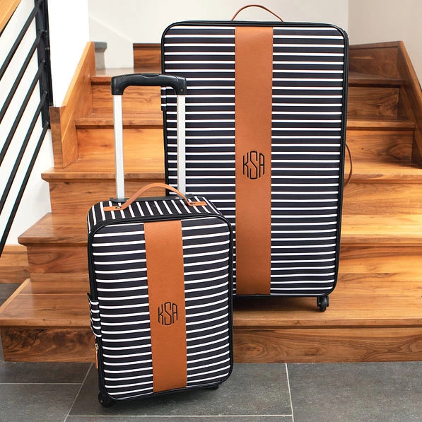Don’t travel light?! Not to worry! Our monogrammed suitcases are large and roomy enough for your next trip! These black and white striped suitcases come in two sizes: one that is the perfect size for a carry on, and the other that is literally every girl’s dream… because you can fit anything and everything in it! The large suitcase has a faux leather handle on the top and the side, and it has four, 360 degree rotating wheels on the bottom. The carry on suitcase has a leather handle on the top and 4 wheels on the bottom. Each suitcase has a large zipper pocket on the inside, as well as a large criss cross strap that snaps to keep all valuables safe and secure! There is also a clear pocket on the back of each personalized suitcase where you can put your luggage tag. Check out this monogrammed weekender and monogrammed cosmetic bag to have a matching monogrammed travel collection!