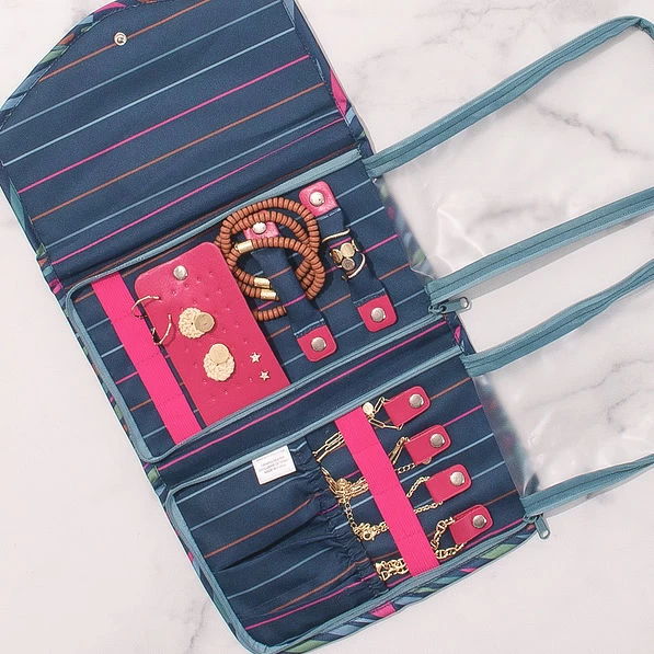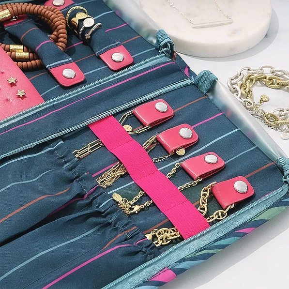 - Includes two snap off ring holders, four snap tabs for necklaces and bracelets, storage for 16 pair of earrings, 8 elasticized spaces to hold jewelry, and three interior elastic pockets