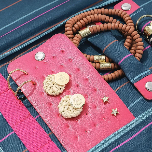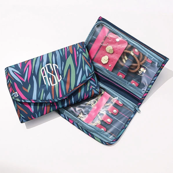 Do you have a hard time figuring out how to pack and organize all of your monogrammed jewelry? This Monogrammed Jewelry Folio has so many ways to store your monogrammed earrings, monogrammed rings, monogrammed necklaces and monogrammed bracelets safe and sound when you travel! This folio has a trifold design with two clear pvc zippered compartments to store your jewelry. Be sure to check out our other Navy Safari items and more in our collection.
