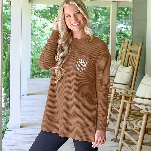 This long-sleeve monogrammed shirt is ready for customization too! You can personalize your crewneck with a variety of fonts, and then drop your initials, name, or letter right on the breast pocket. With over 30 different monogram color options, you can make our Monogrammed Waffle Crewneck Sweatshirt exactly what you’re looking for.