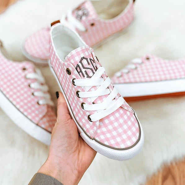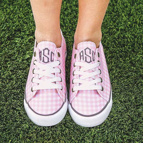 Pretty meets cute with these pink gingham shoes! Featuring non-skid rubber soles, an adorable gingham print, and our exclusive Marleylilly logo on the back heel, these sneakers are perfect for school, weekend outfits, and so much more! We suggest that you not lace up the top hole so that the monogram is visible.