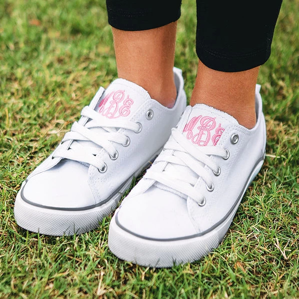Step up your little girl’s style with these white sneakers! So classic and casual, these monogrammed shoes allow her to put her personalized stamp on any outfit this season. Choose the monogram color and font of your choice for a completely custom look.