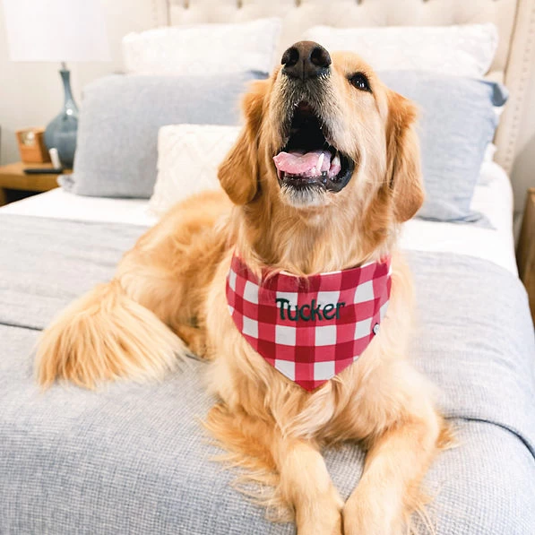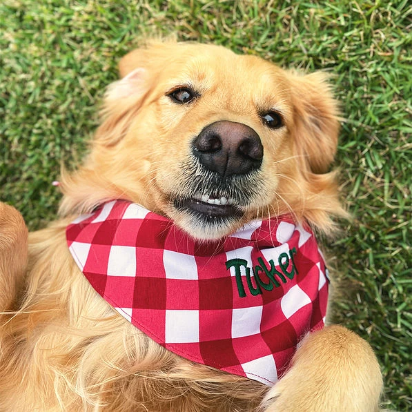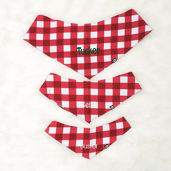- Small: Up to 20 pounds; monogrammed dog bandana is 10” wide