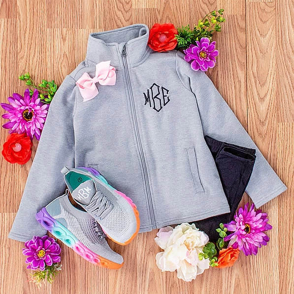 When it comes to easy layering and monogrammed style, our kids’ zip up jacket is a must-have wardrobe essential! This Personalized Kids Zip Up Jacket is an everyday go-to, thanks to its super-soft construction, easy full-zip neckline, and comfortable stretchy fabric blend. Add your favorite monogram on the left chest area by experimenting with our exclusive monogram preview tool — check out monogram styles, fonts, and colors to find your favorite look!