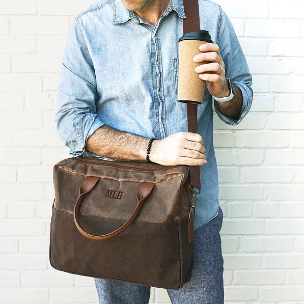 Our sturdy Personalized Waxed Canvas Messenger Bag is the perfect gift for the man in your life! Dads, brothers, boyfriends, and husbands alike will all love this classy shoulder bag for college, business, or even as a carry on. This messenger bag features a zipper top closure with 2 exterior pockets and 1 interior pocket for storage. It also features a removable shoulder strap, adjustable up to 60″, as well as faux leather handles with a 6″ handle drop, making it perfect for carrying your laptop and other belongings. Need more gift ideas for men? Check out our entire collection here!
