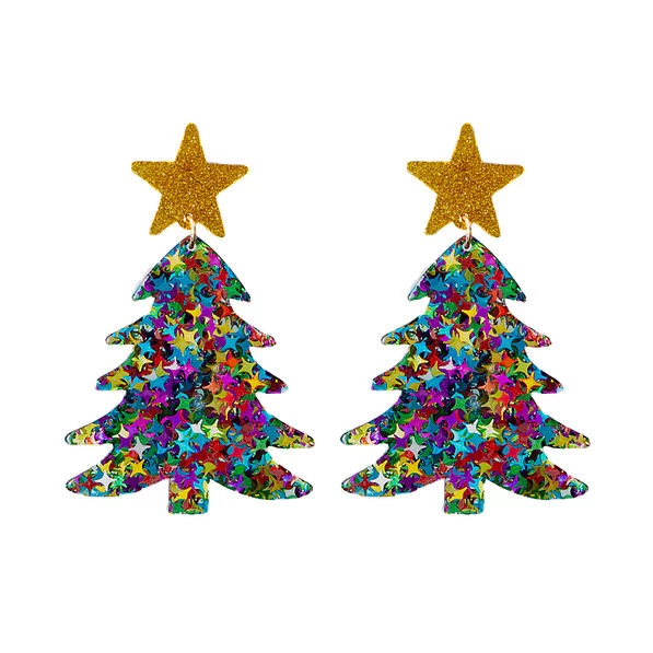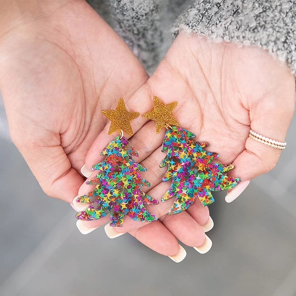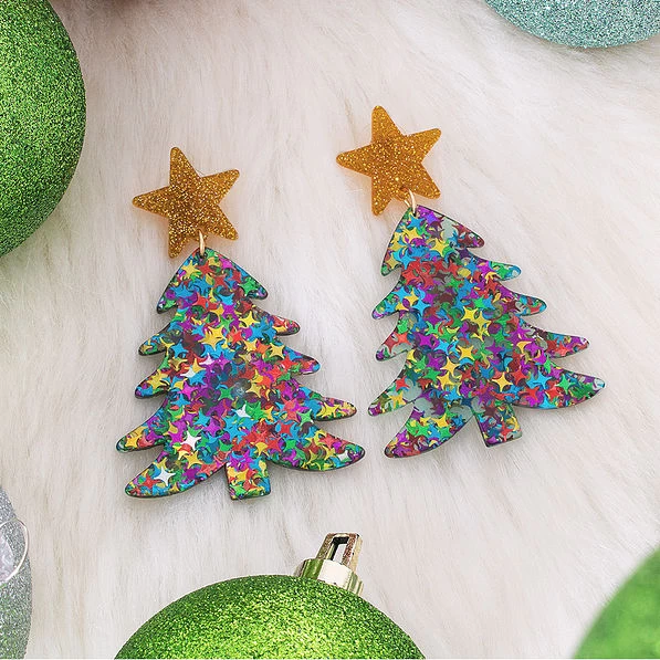 Make a statement this holiday season with these adorable Christmas tree earrings! These fun and festive earrings feature a colorful Christmas tree and a gold star at the top. Pair them with a monogrammed top and some monogrammed boots for the perfect holiday look.
